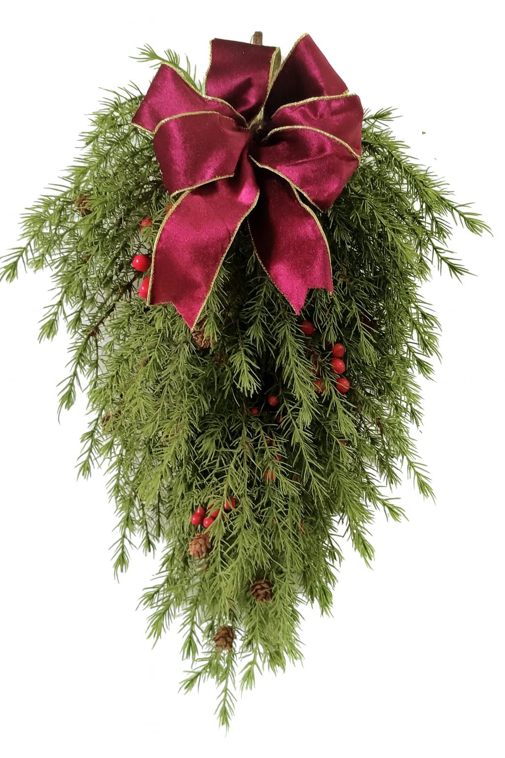 Add timeless elegance to your festive décor with this handcrafted evergreen swag. Made from lush, realistic greenery, it is adorned with clusters of vibrant red berries and natural pinecones, creating a rich seasonal texture. The piece is finished with a statement merlot velvet bow, edged in gold for a touch of luxury.