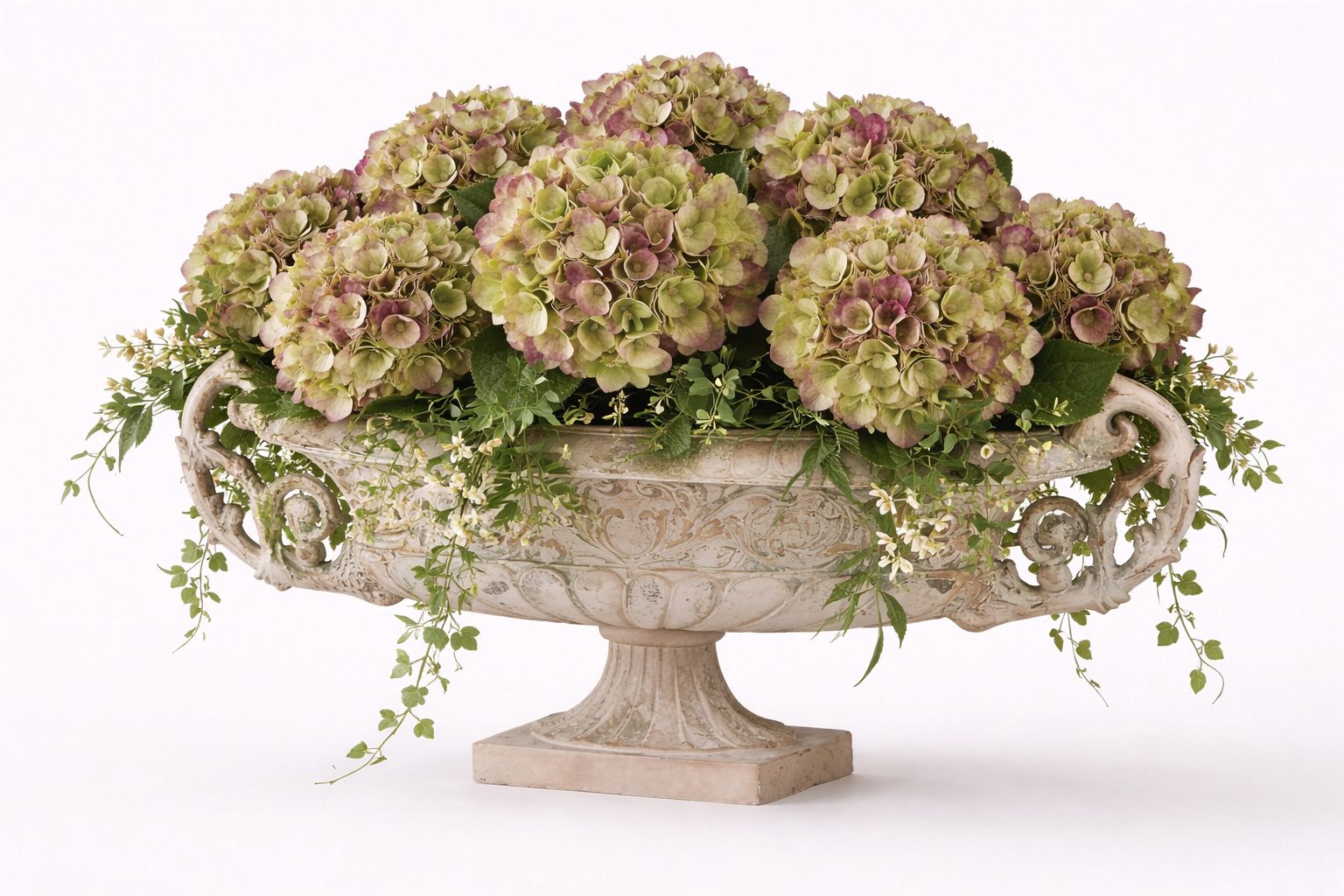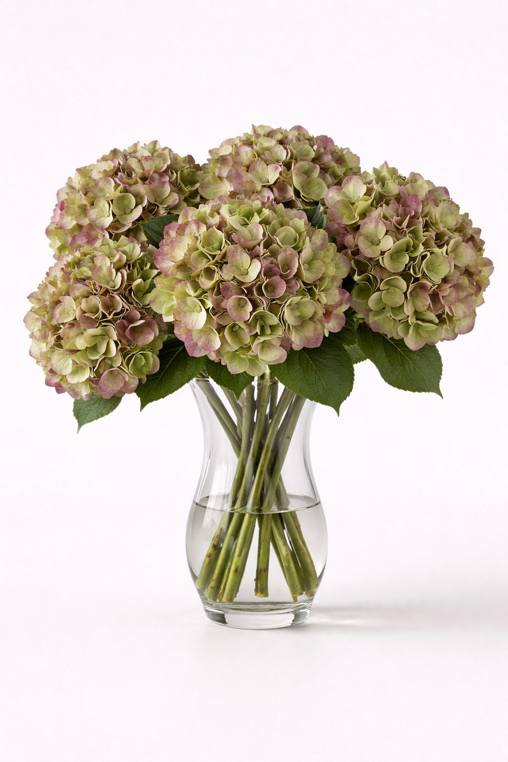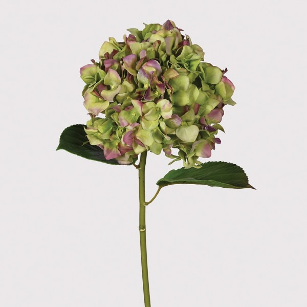 A beautifully crafted hydrangea stem featuring soft pistachio green petals delicately touched with rich aubergine tones, creating a sophisticated and natural garden-inspired look. Designed with a premium real-feel finish, the bloom replicates the texture and fullness of fresh hydrangea while offering the durability and longevity of a high-quality faux floral.